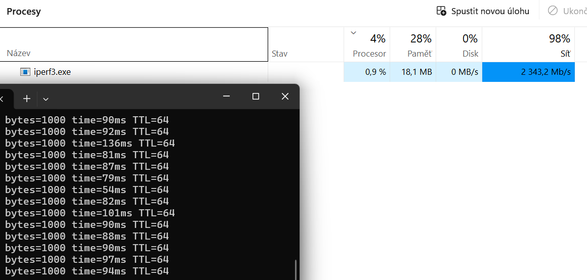 Takhle vypadá pokus o 100 spojení (plnou rychlostí) přes iperf3, kdy kilový ping je kolem 90 ms.