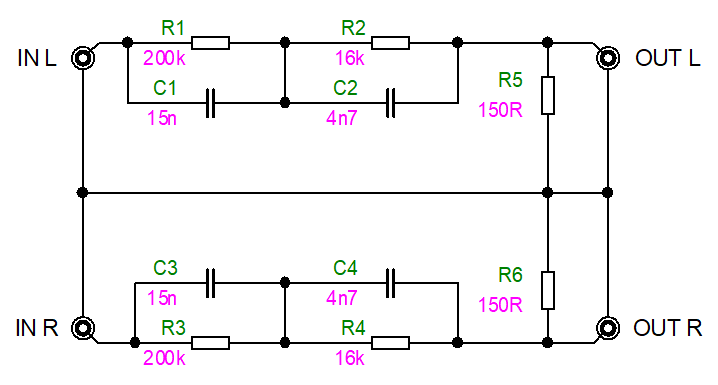 Ještě jsem si vzpomněl na jedno udělátko, ale to je jenom na zkoušení. Když potřebuju rychle zkusit funkčnost PHONO vstupu a nechci zesilovač stěhovat ke gramofonu a všecko přepojovat, mám v malé kovové krabičce pasivní dělič/filtr pro buzení PHONO vstupu běžným linkovým signálem. Není to hifi, jenom na zkoušku funguje-nefunguje. Vlivem výstupní impedance zdroje signálu se malinko zvlní horní konec pásma, ale nic dramatického. Kdyby to nebyl principielní nesmysl, normálně by se to dalo poslouchat. Ale to by člověk musel bejt fakt divnej.