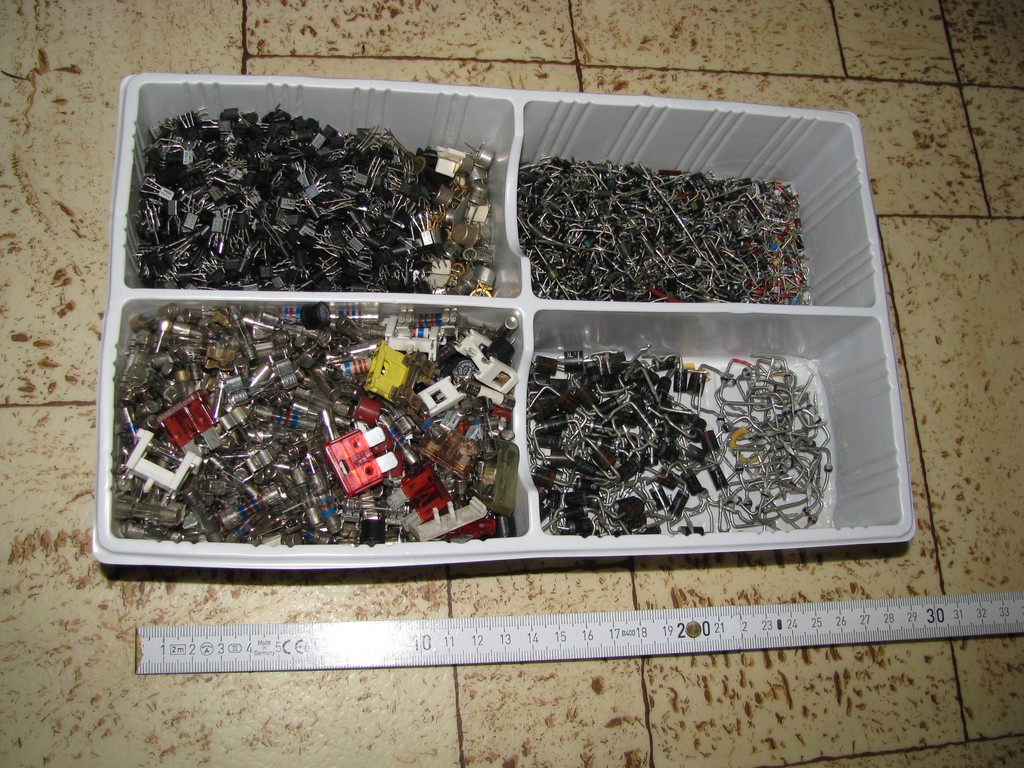 Vlastním tři MARSky, tj. 180 zásuvek (=až 540 položek). Ale všechno má svůj řád. Nejprve se vypájené věci hází bez třídění do pizzy (krabice od kotoučů na součástky SMD) rozměru typ. 35×35×6[cm]. Má to tu výhodu, že když nastane řev, je možno všechno velmi rychle "uklidit". Pak se třídí dle druhu (to jsou ty vaničky KOMBE®). Smile A nakonec se za dlouhých zimních večerů Laughing rozhazují do MARSek dle hodnot. Ovšem např. cihlových odporů se tam stejně mnoho nevejde, ty zůstávají ve dvou špindlech (na 50 DVD), případně v jedné nízké pizze. To samé platí pro výkonové stab., tranz., kvádrové C (na velké elektrolyty mám barel SYNTHA-6), velké diody a můstky. Mišík, Mišík, Mišík. Děkuji za pozornost