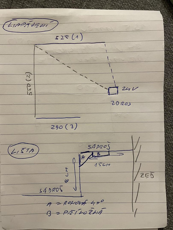 - stran hlinikove listy do ktere paska prijde. Budu mit podle zdi sparu cca 15 cm abych do ni mohl zapustit lyzinu na zaclony a do ni bych rad pasku umistil. Je podle vaseho nazoru lepsi pouzit rohovou listu (druhy nakres, varianta A), takze paska pod uhlem 45 stupnu osvetluje zed, nebo dat jen priloznou lisu ( na nakresu varianta B), takze paska by svitila primo smerem folu na zem?