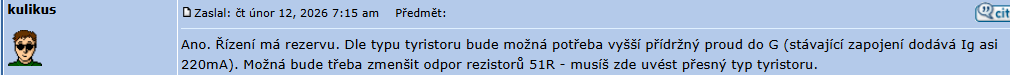 Ano. Řízení má rezervu. Dle typu tyristoru bude možná potřeba vyšší přídržný proud do G (stávající zapojení dodává Ig asi 220mA). Možná bude třeba zmenšit odpor rezistorů 51R - musíš zde uvést přesný typ tyristoru. _________________ pro mládež a lektory - Hamíkův koutek