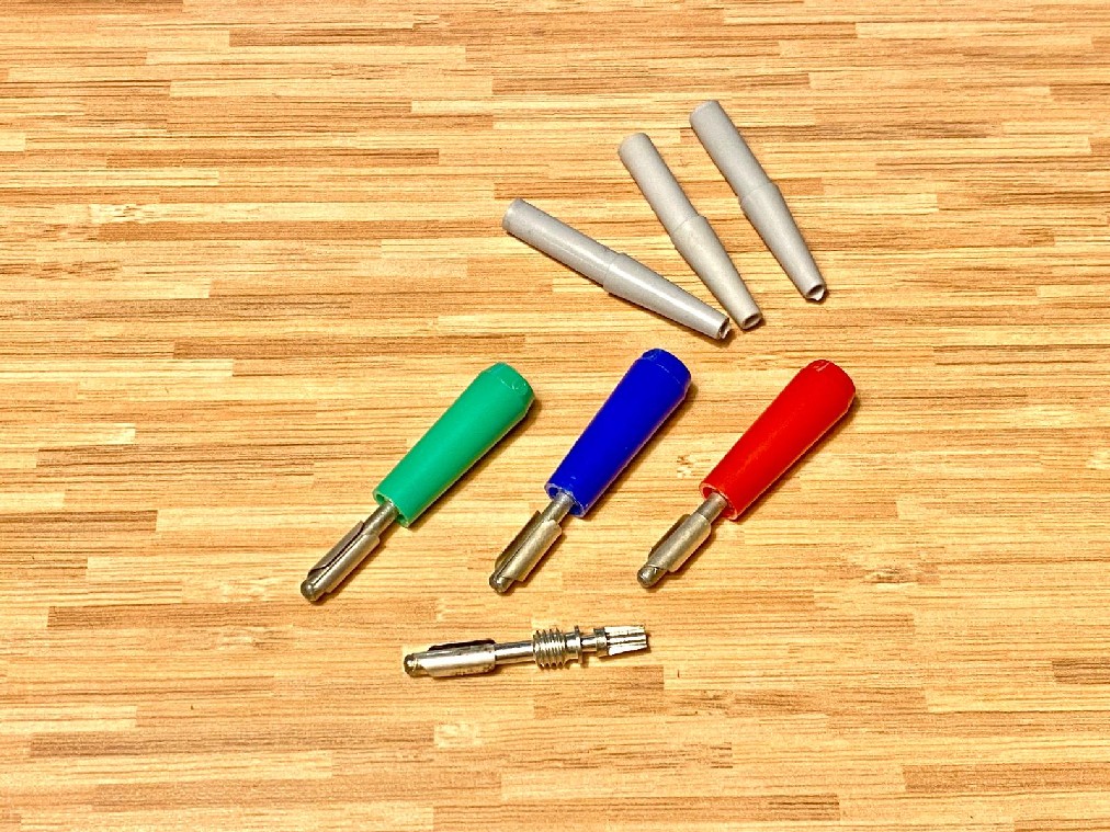 Na Temu jsem objednal mimo jiné i banánky. Mají ale jednu chybu, pružná manžeta se volně otáčí a přechodový odpor se mění. Upravil jsem je připájením manžety k tělu banánku. Je třeba ho rozebrat, použít pájedlo s výkonem alespoň 100 W a dobré tavidlo. Použil jsem zbytky Eumetolu, který mám dlouho z dob totality. Další nectností banánků je šroubek držící vodič, lze se ho při měření dotknout. Přetáhl jsem přes něj proužek smršťovací bužírky a ohřál. Výhodou banánků je otvor z boku a možné jejich propojování.