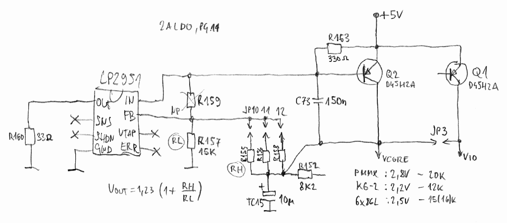 Tak druhe VRM pro Vcore doosazeno, akorat mam problem sehnat PNP trand s dostatecnym h21E, zkusil jsem z GM vybrat 2 nejvhodnejsi kandidaty BD712 a MJE2955 a pri IC 3-4A zesileni klesa nekam na 25, coz ten obvod LP2951 neubudi. Pro intel Pentium MMX to v poho staci, ale treba zrave Cyrixe 6x86 uz maji problem. Nehlede ze to topi jak prase, lepsi desky mely uz spinane VRM...