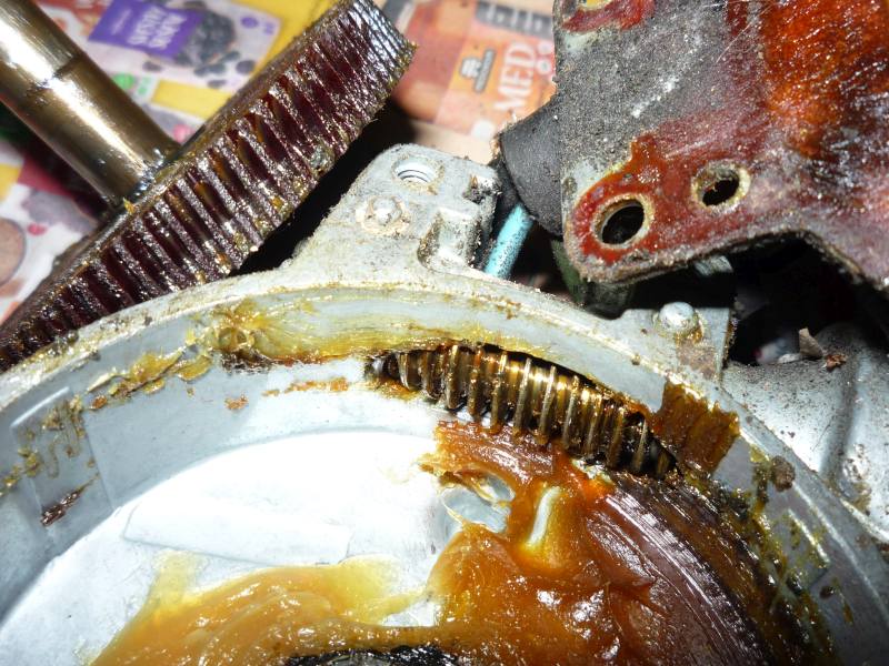 "Pokud tedy přes řetězový pastorek- bez napětí -motorek neprotočím, asi do sebe zuby zapadají. Při pohonu z hřídele motoru se snadněji uplatňují vůle a opotřebení ozubení, než při pohonu z výstupu převodovky. Tento šnekový převod je, jak už jsem psal, samosvorný a snaha roztočit ho z výstupu může skončit jeho dalším poškozením, zjevně jde o kolo z texgumoidu.