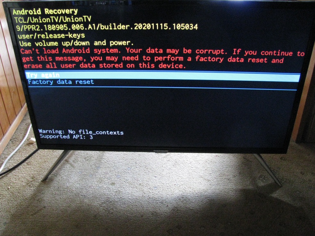 "Thomson" 32HE5606. Od servisní rampy za naším OÚ (stabilně tam dlí výměnná korba s kovovým šrotem). Neprošel deštěm/ranní vlhkostí. Nemá žádná tlačítka, krom mikrospínače POWER (symbol IEC 60417-5009). Po zapojení se rozsvítil displej, ukázaly se čtyři grafické multimediální symboly ála androidový tablet a skončilo to na... viz foto. Zatím nemám přírodažel D.O.