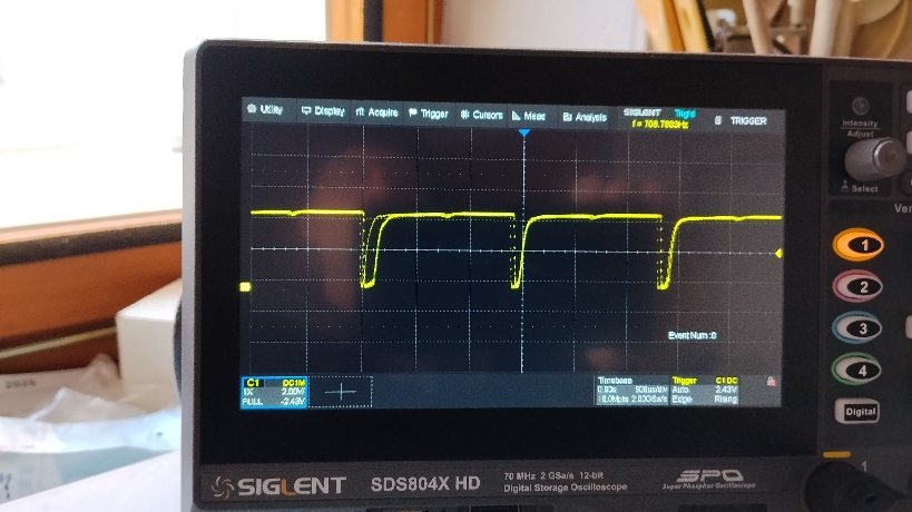 Ten průběh na T5 by měl mít také stejnou střídu jako multivibrátor. Zkontroluj si průběh na T3 vysílače a hodnoty součástek přijímače, popř. sniž výkon...
