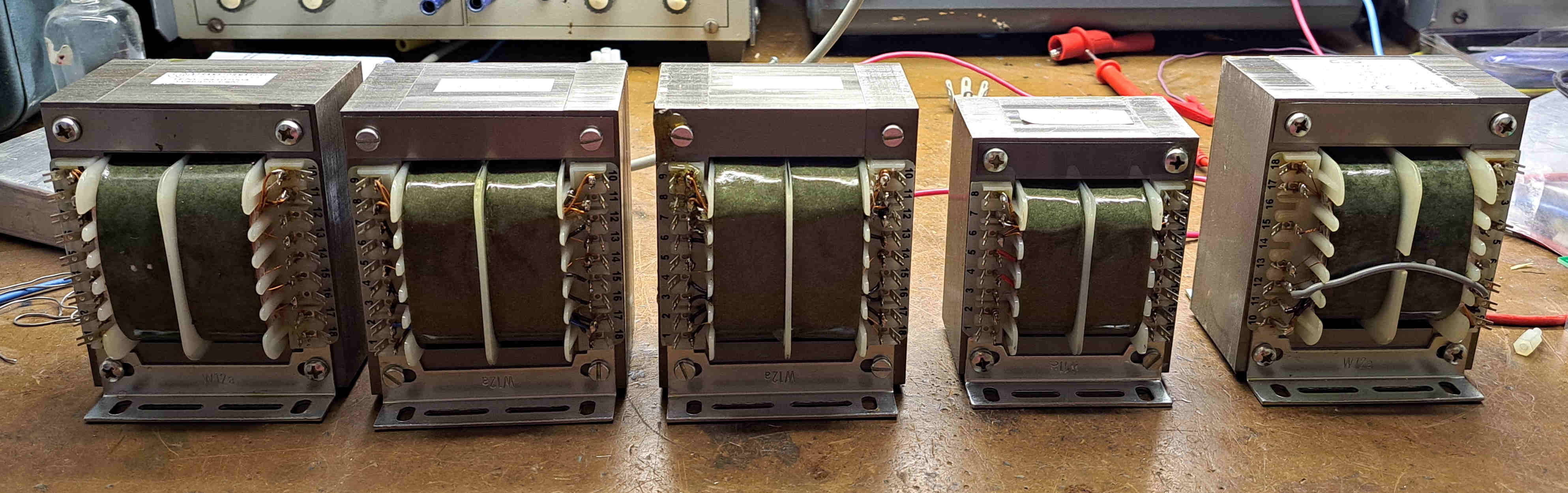 A tahle vypadají trafa na 60W s GU50, nebo 40W pro 6L6, úplně vpravo výstupák, co prodával GES.