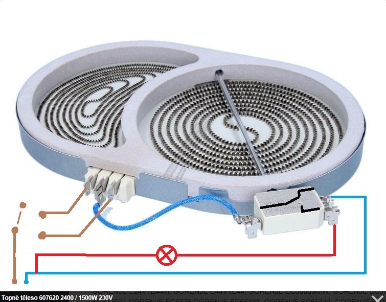 Plotýnka je ale jinak zapojená, má i jiné ohmické hodnoty. Navíc mi při odklápění horní desky s plotýnkami odněkud vypadl jeden vodič – je to společný vodič pro signalizaci rozehřáté plotýnky. Neměl byste někdo k dispozici schéma zapojení? Předem děkuji.