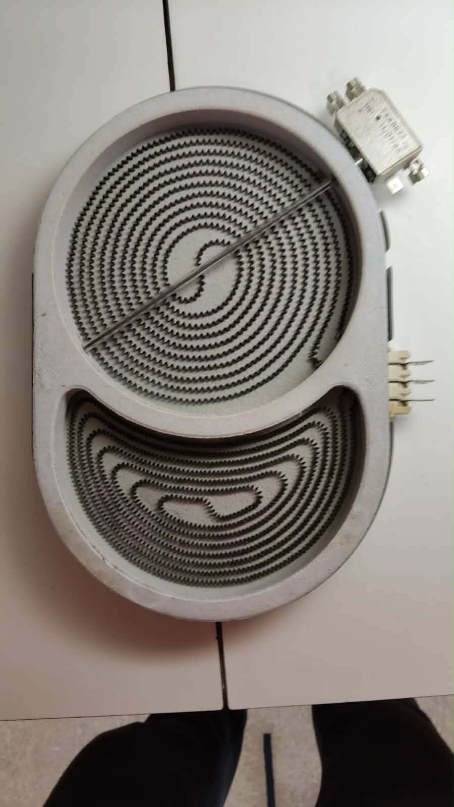 Jiné odpory topných spirál, jiné provedení, to je na reklamaci. Pokud to není na pořadu dne tak změřit termostat za studena a při ohřátí a zapojit stejně jak to bylo předtím, hádám: vypnuto, jedna plotýnka, druhá plotýnka a regulace přes termostat...viz obrázek?