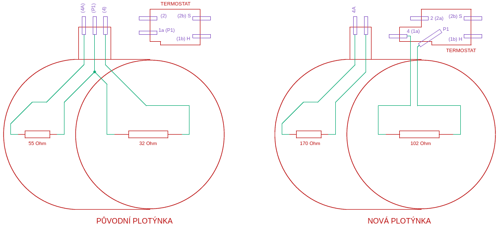 Jiné odpory topných spirál, jiné provedení, to je na reklamaci. Pokud to není na pořadu dne tak změřit termostat za studena a při ohřátí a zapojit stejně jak to bylo předtím, hádám: vypnuto, jedna plotýnka, druhá plotýnka a regulace přes termostat...viz obrázek?