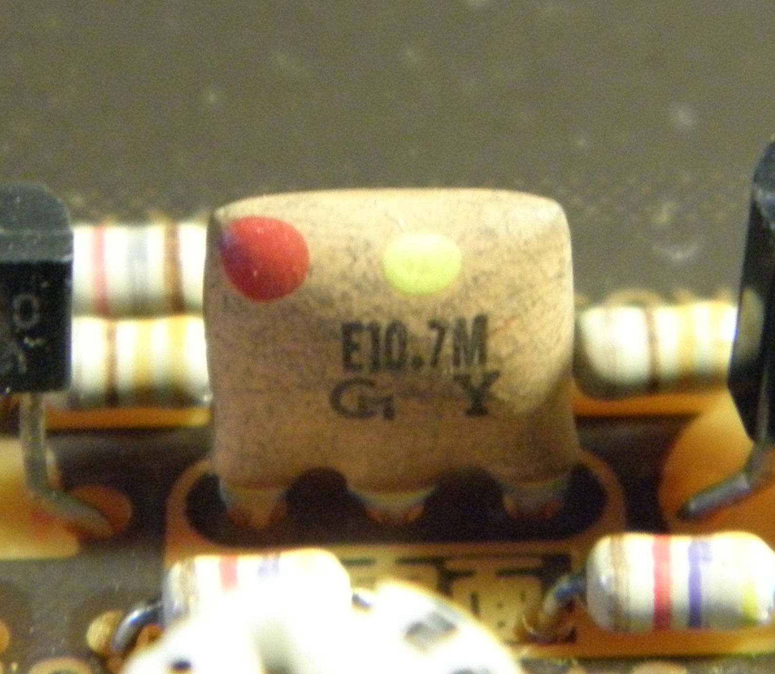 Včera mi to přišlo poštou. Hned na první dobrou osciloskop ukázal, že za vstupním dílem mf signál 10,7MHz je, při cca 20mV šš (na osciloskopu C1-94 s rozsahem do 10MHz takže spíš indikátor přítomnosti signálu) na vstupu FI1, za FI1 není NIC. Pokračování později, hledám co znamená označení filtru (viz přílohy) a čím ho nahradit. Dle zapojení a použití soudím, že vhodný bude 10,7MA. Červená tečka je jasná, žlutou jsem ještě nikde neviděl (asi výběr), dostupné tabulky prohledány. Stejně tak jsem ještě neviděl zdechlý keramický mf filtr fy MURATA, chcípají filtry RFT. Straší mě představa, čím ten majitelův "odborník" ještě kroutil.