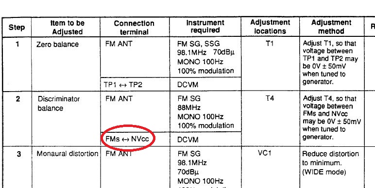 Obávám se, že to nastavení nuly diskriminátoru není v manuálu/schematu dobře popsáno. TP4 je "středové" napětí pro OZ, získané dělením +12V na polovinu (R108/R114), t.j. +6V a při vyvážení T3 na "0" musí být stejné napětí i na děliči R109/R111 diskriminátoru, tedy +6V. Bod TP3 je na schematu výstup IC5 pro AM(pin 8 ), což mi nedává smysl, spíše by to měl být výstup IC5 pro FM(pin 2). Takže si nemyslím, že by obvod T3 bylo třeba nějak drasticky přelaďovat hliníkovým/mosazným jádrem, spíše přehodnotit postup.