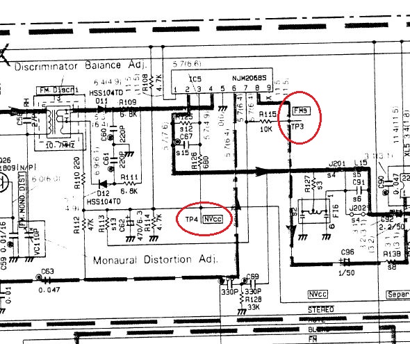 Pohledal jsem a našel YAMAHA tx 550, tam je schema přehlednější (ale jiné číslování součástek) ovšem system nastavení je stejný, viz přílohy, jen vývody a tedy měřicí body (na 550) jsou jinde a nejspíš správně (?!). Ještě další - TP4 je správně TP3 asi jinde, viz přílohu.
