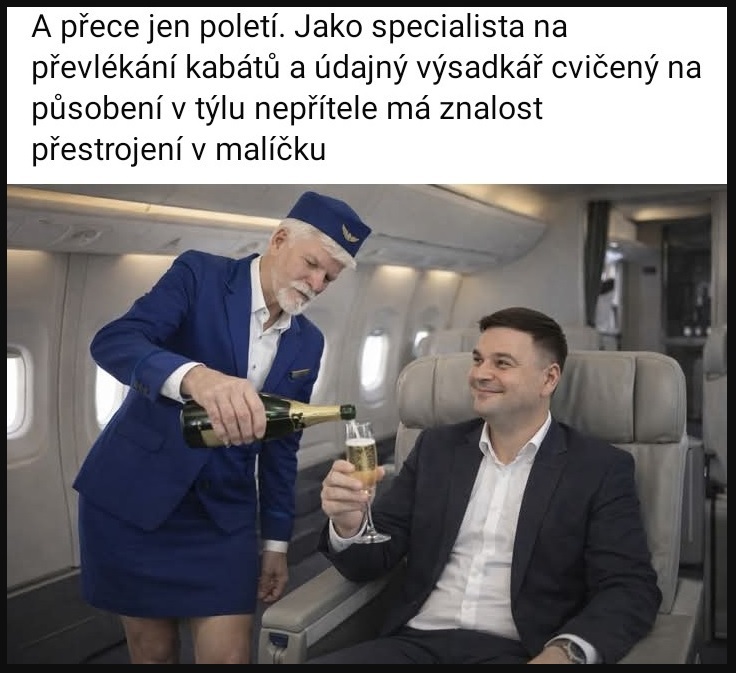 Máš v tom svým ftipu "drobnou" faktickou chybku, Bořku. PePa NENÍ ÚDAJNEJ VÝSADKÁŘ. Současnej prezident ČR je BEJVALEJ příslušník výsadkovejch vojsk a jako takovej si musel svoje penzum chcačky nechcačky odskákat, na to žádnej pardon nebyl ani za komančů. Červenej baret se na rozdíl od kupy závěsnejch cingrlátek nejvyššího stupně jen tak někomu zadarmo nedával.