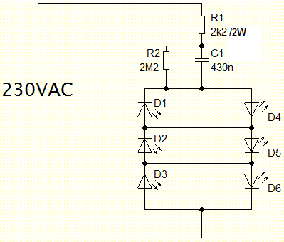 Dioda v sérii ti kvůli předřadnýmu kondu nestačí musel bys použít můstkový usměrňovač. V jedný půlvlně Ti svítí první trojice LED a v druhý Ti svítí druhá trojice LED. Diody se vzájemně doplňují v rytmu 50Hz..