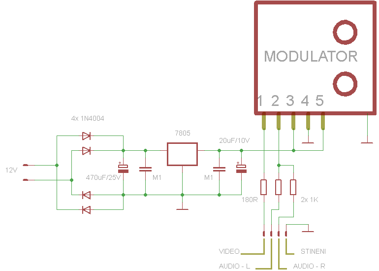 na tohle nepotřebuješ schéma.Je to jen zdroj a modulátor na jedné desce.Nic víc,nic míň.Modulátory mají přímo video a audio (mono) vstup a napájení.Zatím jsem se setkal s modulátory na 5V;9V a 12V