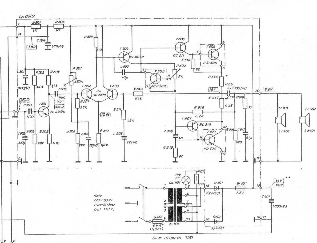 Je třeba prověřit bez vyjímky všechny polovodiče konce a to nejen diodový test , ale i napěťovou odolnost , která se může snížit "po ráně".Můžeš k tomu použít i zdroj zesilovače , vyvedeš + přes odpor cca 22k a zapojíš na měřák napětí .Ten Ti ukáže plné napětí . No a pak připojuješ samostatné polovodiče . Kolektor na + emitor na- u NPN , alespoň to doufám víš . Pakliže budou v poho , tak můžeš zes zapojit . Tedy až poté , co nejlépe vyměnit nebo alespoň namazat a protočit P502 a natočit na stav zkrat B-C. Zes zapoj přes žárovku cca 40W . Tak nemohou při další závadě , či kmitání odejít koncové trandy . Když árovka blikne a pohasne , máš vyhráno . Měř napětí na C510 . Musí být polovina napájecího . Připoj vmetr na emitorové odpory koncových trandů , mělo by tam být nulové napětí , tak postuppně otáčej trimrem P502 , až se na odporech nějaké napětí objeví . Stačí 10-20mV . A pak připoj repra a dotkni se C505 a musí "vrčet". Zapoj síť natvrdo a znova se dotkni C505 a musí silně bručet . Po dotyku na C503 musí jít zes naplno .Tím laicky vyzkoušíš kondy . Pokud nebude bručet , přiletovávej paralelně k těm kondům ještě nový kond . Mnoho zdaru .
