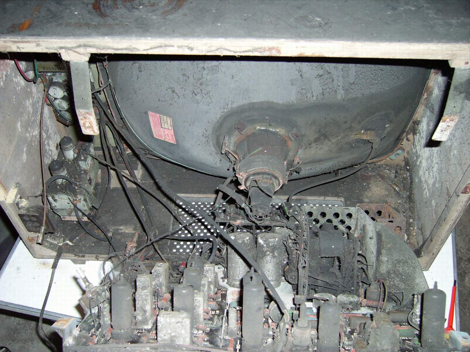 Vnitřek mírně shnilého a vyuzeného televizoru (Tesla Dajana) uloženého v boudě s 100% vlhkostí, která následně vyhořela... Cool