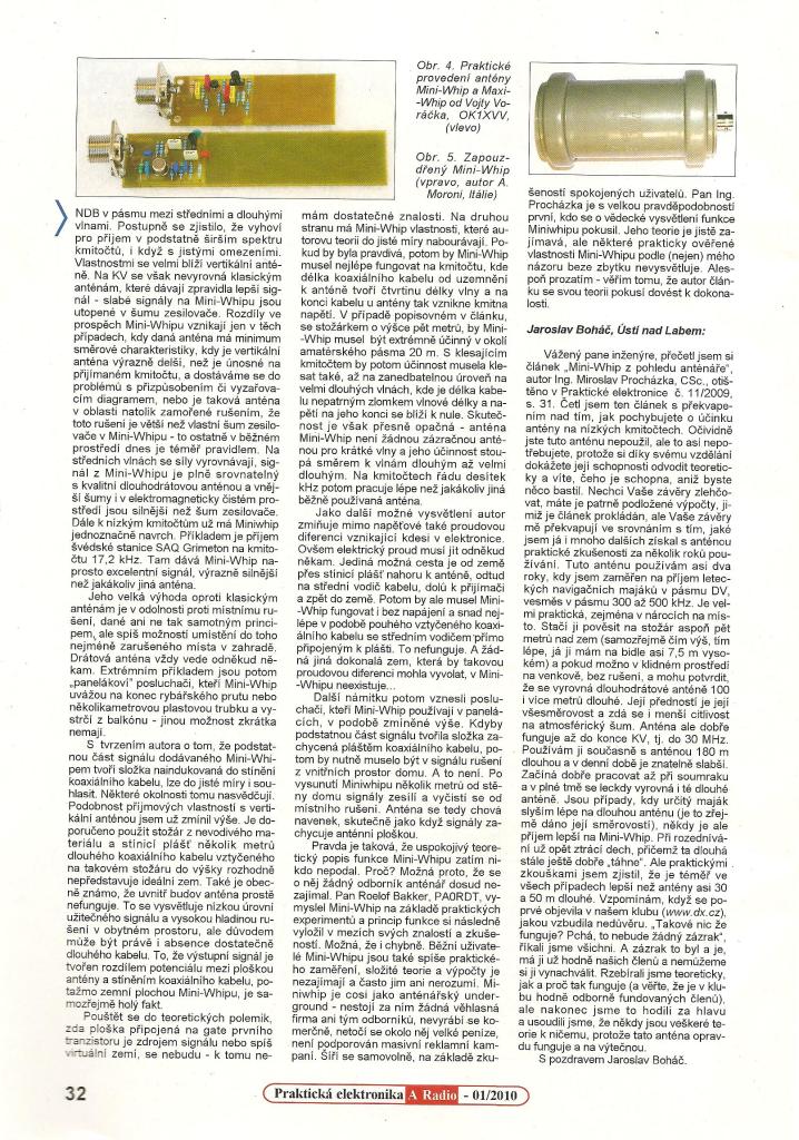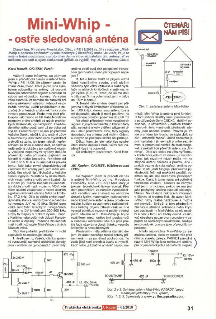 Musím říct, že psát kritiku na něco, co dotyčný patrně nestavěl ani nezkoušel, mi připadá dosti nesmyslné, až pitomé. Kolegové z DX klubu či z HAM mají ve svých názorech pravdu. Já už stavěl několik kusů mini-whip v různých i svých modifikacích a všechny s pozitivními výsledky! Též jsem si delší dobu dopisoval s PA0RDT, autorem dotyčné antény, což asi autor článku v PE11/2009 ke své škodě neudělal.