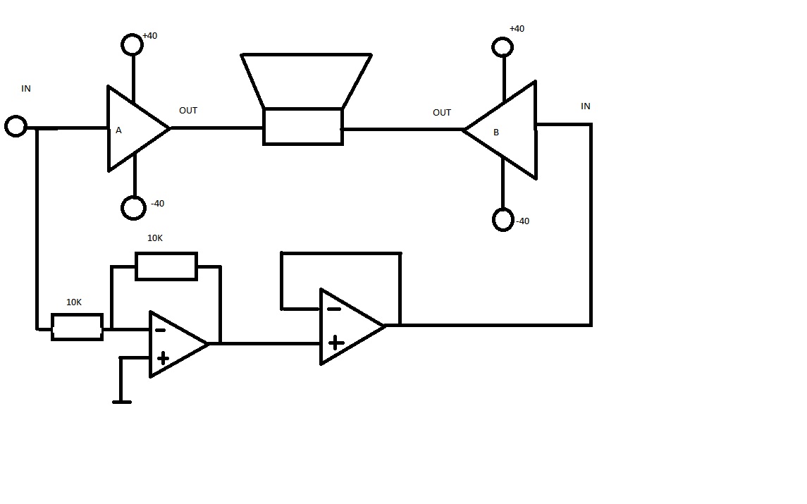 Maty727 - vstupní napětí je jedna věc, odebíraný proud věc druhá - jestli Ti to začalo kmitat, jak správně usoudil kolega mtajovský, vyletěl odběr někam k nebesům a 100mA stábl to prostě výkonově neudejchal a taky odletěl. Vyhoď minimálně ten druhý operák, je tam úplně k prdu - a ten první je taky diskutabilní, pokud výkonový zes sám o sobě invertuje vstupní napětí. Stačí jen odporový dělič z výstupu prvního koncáku (dělicí poměr nastavit podle zesílení toho výkonového stupně vpravo na schématu - aby JEHO výsledné zesílení bylo -1) a pro subák to musí stačit...