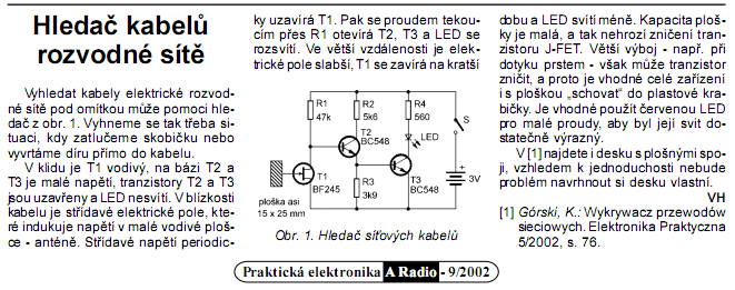 Ahoj. Ja tomu ale vubec nerozumim. Ale hledam navod na detekci kabelu pod napetim pod omitkou. Proc? Nemam 15tis na to abych si to koupil. Bohuzel, ale myslel jsem si, ze by mohlo existovat neco jednoducheho a presto docela presneho - to co prodavaji do 2tis Kč je na nic. Ja potrebuji vedet kde mam vrtat hmozdinky cca do 1cm a tohle je tolerance 1metr +/- a to bere armatury i zelezo proste vsechno kolem takze kdyz to zapnu pipa to i uprostred mistosti 4x4m a to je dost na nic. ano chci zazrak za par kacek co treba presne nastaveny filtr 45-55HZ nebo ja nevim co, jste moudri mate nejaky napad ? Dik i za snahu. Jo nejde o f-tip docela by to bodlo i jinejm elektrikarum