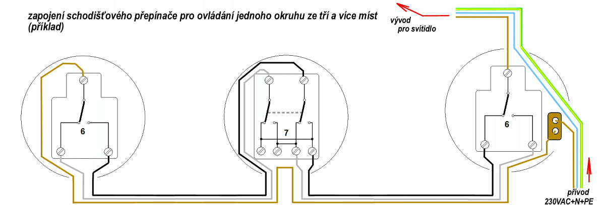 Schodišťové zapojení s ovládáním ze tří míst (použité střídavé přepínače č.6 a jeden přepínač č.7)