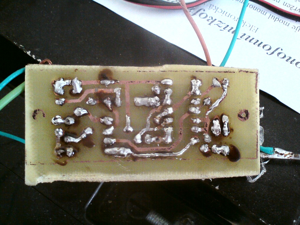 Na tej fotke ,pohlad zo spod dps sa mi zda ze mas preruseny plosny spoj na IO od vrchu co je prepojeny 2-3 pin a ide na 5 pin+este niekde.Na fotke to aspon tak vyzera.Ja to mam tiez uz roky spravene a fungovalo mi to na prve zapojenie.Zelena dioda ma svietit stale(mas zapnutu skusacku) a cervena tiez ale ked spojis kontakty tak ma zhasnut.(ked zhasne mas na vystupe skrat)