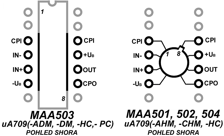 Jde to tak, jak vidíš v příloze (už jsem to tu nechával dříve jako fotku, ale takto to bude snad jasnější). Šedé vývody (a otvory v desce) všude nenajdeš, nevyužité konce zbytečně nevyužitého pouzdra MAA503 nakonec můžeš opatrně odříznout... samozřejmě, budeš-li dávat ten kovový za DIL, jednoduše ty ostatní vývody nepoužiješ.