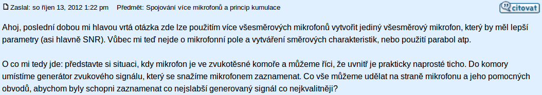 Ahoj, poslední dobou mi hlavou vrtá otázka zde lze použitím více všesměrových mikrofonů vytvořit jediný všesměrový mikrofon, který by měl lepší parametry (asi hlavně SNR). ...
