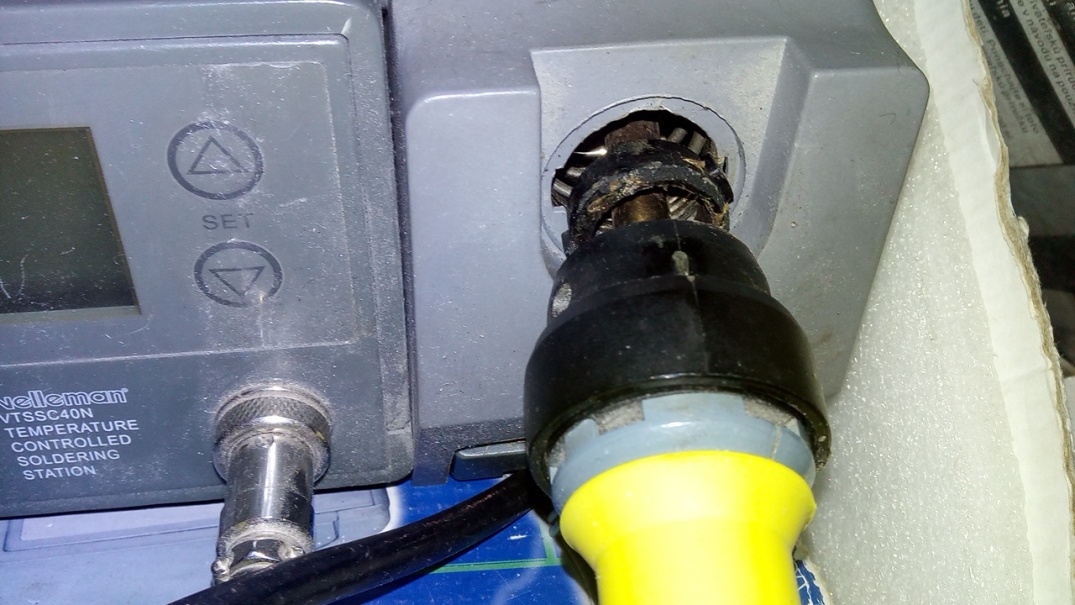Hrot není moc kvalitní, ta žlutá guma na plastu pera nedrží a sklouzává, kryt je plastový - není odolný proti náhodnému dotyku zahřátým hrotem - a to včetně držáku pera (ve kterém se mimochodem uvolňuje pružina, uchycená jen jedním vrutem, takže teď visí na drátku) a šuplíku pro houbu. Ta akorát měla plechovou "vaničku". Když jsem viděl vnitřek toho zmíněného konektoru, bylo mi z těch pájených spojů zle Confused