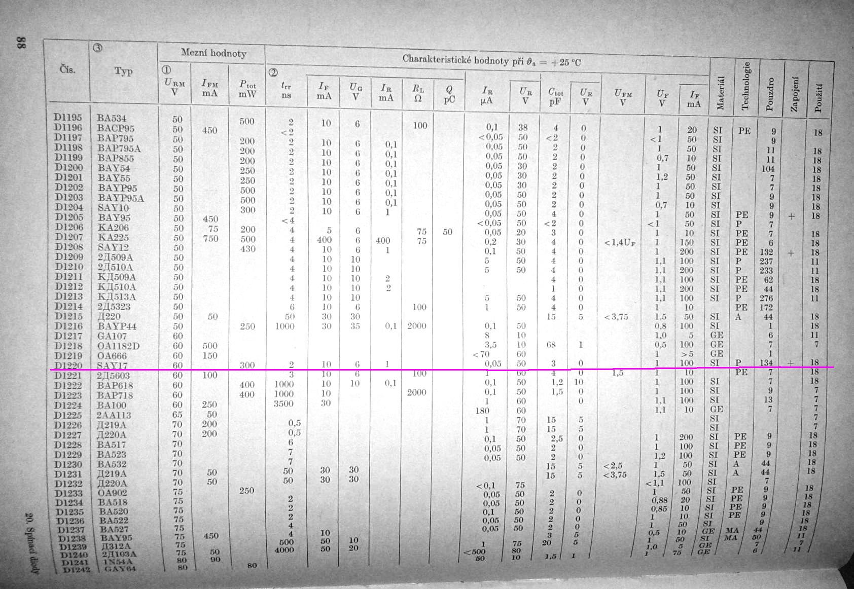 - doba zotavení do 2 ns při zavírání z ustáleného proudu 10 mA na závěrné napětí 6V, čas měřen při poklesu proudu na 1 mA.