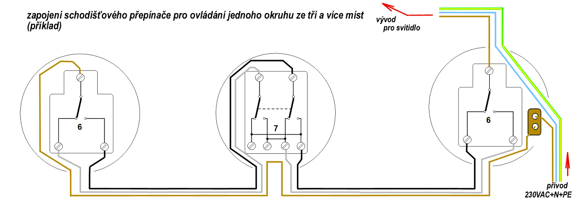 Dva příklady zapojení schodišťáků s křížákem pro ovládání ze tří míst přikládám.