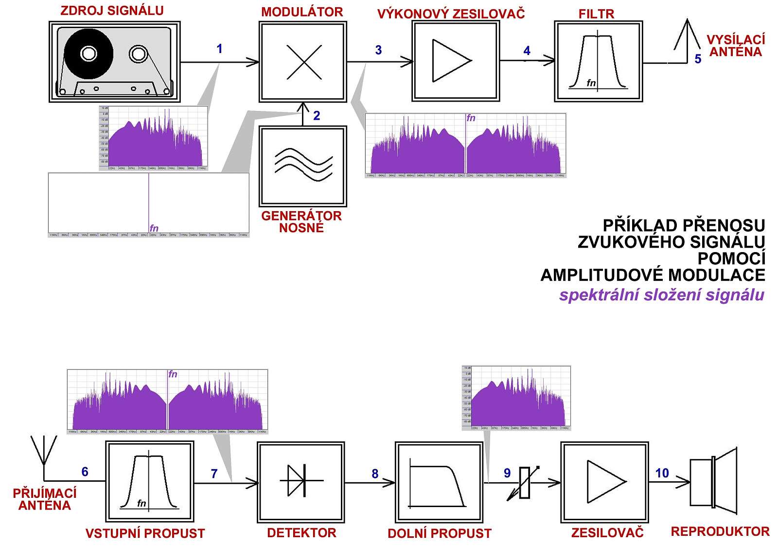 Zjednodušené blokové schéma AM řetězce se zobrazení spekter signálu.
