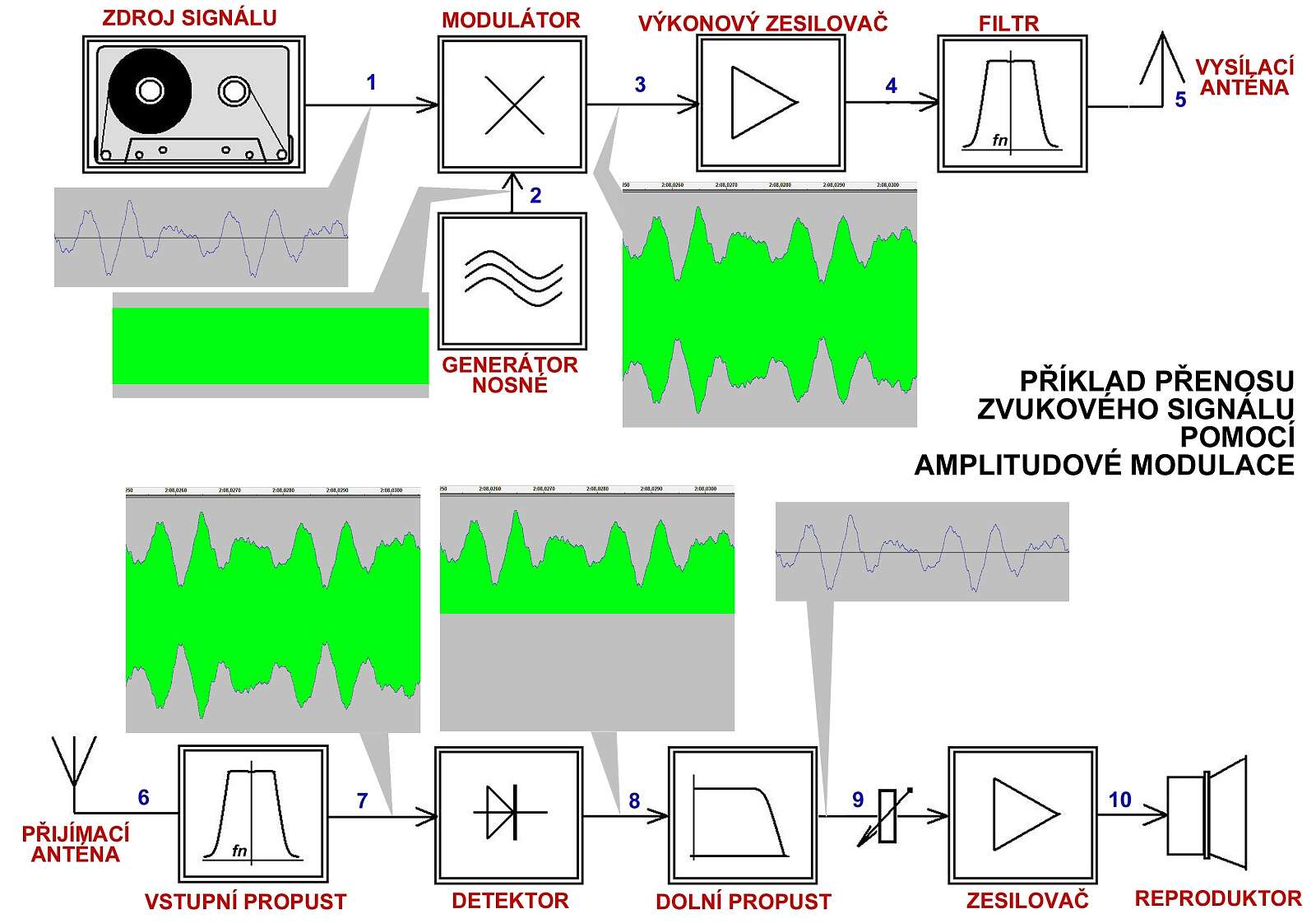 Zjednodušené blokové schéma AM řetězce se zobrazením časových průběhů signálu (nosná je tak hustá sinusovka, že se slila do jedné zelené)