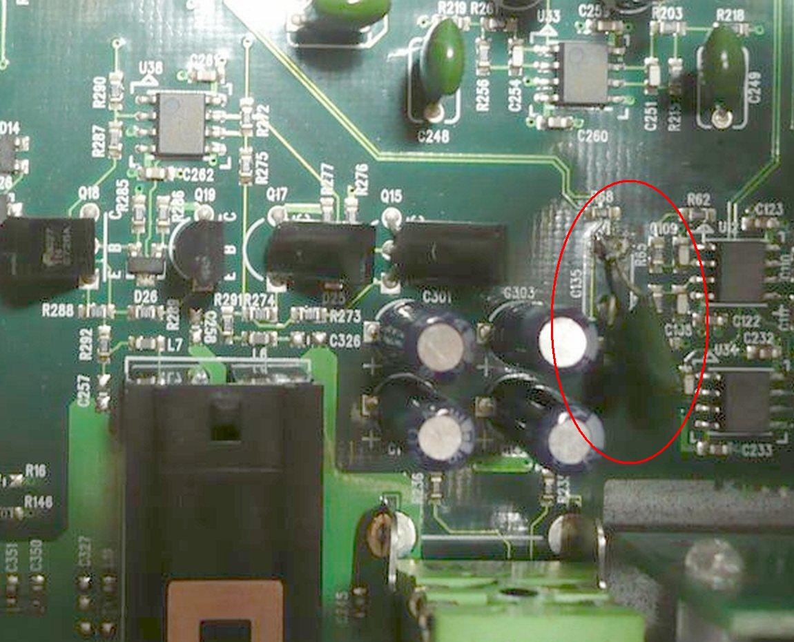 Jek je to napájené, nevím. Ty cesty jdou na druhou stranu desky. Regulace hlasitosti je propojena se 4mi modrými kondenzátory. Od nich vlevo je obvod se dvěma zelenými kondenzátory, ve kterých se vrtal opravář, co si s tím nevěděl rady a vrátil to, že bez schématu s tím nic neudělá. Nevím, tak třeba tam může být napájení.