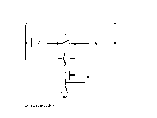 Nemůže odpadnout, když nebylo ještě sepnuté. Stisknuté tlačítko po sepnutí relé A zkratovává relé B. Po uvolnění tlačítka dřív než stačí odpadnout kontakt a1, spojí do série relé A i B. Wink
