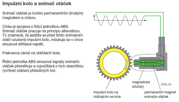 Celej FTIP je v tom, že pokud se snímač chová odlišně podle připojený polarity napájecího (měřicího) napětí, pak v čidle je "Naumurův senzor" = oscilátor LC s cívkou na otevřeným magnetickým obvodu. K tomu "otevřenýmu" konci se přibližujou "zuby" na kroužku v ložisku a podle toho jestli k cívce je přiblíženej zub nebo mezera se mění magnetickej tok jádrem = a od něj je i závislej proudovej odběr LC oscilátoru. Mezní případ je takovej, že oscilace při přiblížení nadměrně masivního kusu magneticky vodivýho materiálu vysadí. Nejdůležitější na funkci je odběr proudu toho oscilátoru - s přiblížením "zubu" se zvětší - takže stačí celý čidlo napájet ze zdroje napětí se sériovým odporem a na tom pevným odporu vzniká impulsní signál s kmitočtem odpovídajícím kmitočtu přiblížení"zubu" k cívce a s amplitudou určenou tím odporem a odběrem čidla. Vyhodnocení dělá řídicí jednotka ABS a pokud to má v programu, tak podle rozdílu otáček při započetí jízdy a po určitý době jízdy umí i detekovat únik vzduchu z pneumatiky.