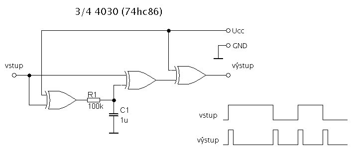Pokud potřebuješ impulz v obou případech (při zapnutí i při vypnutí), pak můžeš použít následující zapojení. Délka impulzu je dána konstantou R1C1 (např. 0,1s). Wink