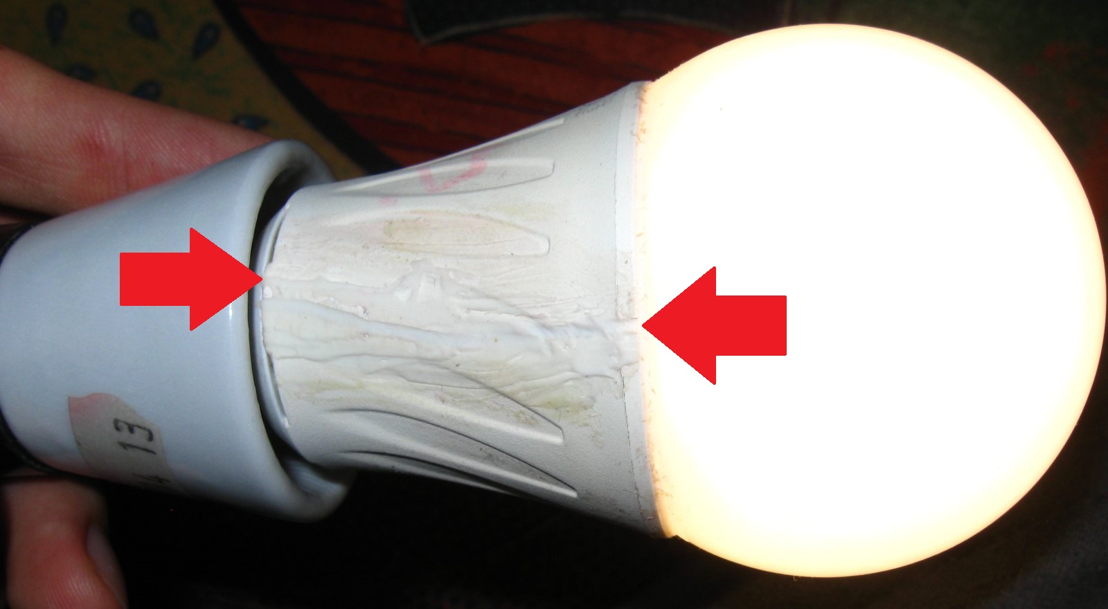 Též bylo nutné zatmelit prasklinu v plastovém pouzdru. Pod ním je totiž chladič spojený s fází. Měnič pro led obsahuje pouze tlumivku, nikoliv oddělovací trafo.