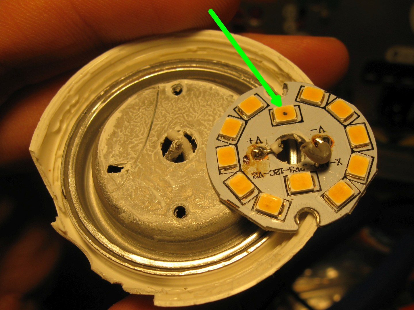 A kuchnul jsem to 11W Livarno z Lidlu, kterou jsem našel ve smeťáku. Měnič byl poddimenzovaný, místo trafa měl jenom tlumivku. Asi se upekl. Neopravitelné, byl zalitý v jakési gumě, kterou jsem vyrejpal. A závit E27 byl ze strašně měkkého a tenkého plechu, takže se mi rychle zkur\/il. Jenom ten LED modul byl docela v pofhodě a rovněž hliníkový chladič byl docela dobrý.