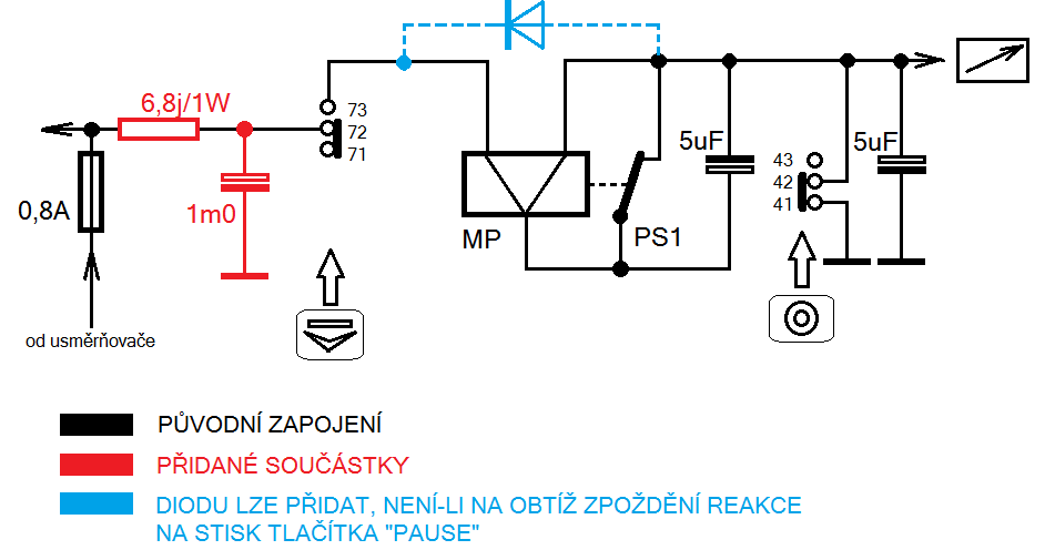RC článek (červeně vyznačený) potlačuje pokles napětí zdroje během přítahu magnetu. Ten v okamžiku stisku tlačítka "posuv vpřed" (a, je-li stisknuté, pak při uvolnění tlačítka "pauza") pokryje nábojem část odběru magnetu a zdroj to tolik nepocítí. Po rozepnutí pérového svazku magnetu se jeho odběr sníží, takže odpor vložený do přívodu napájení se nijak rušivě neuplatní. V klidu se normálně kondenzátor nabije na plné napájecí napětí.