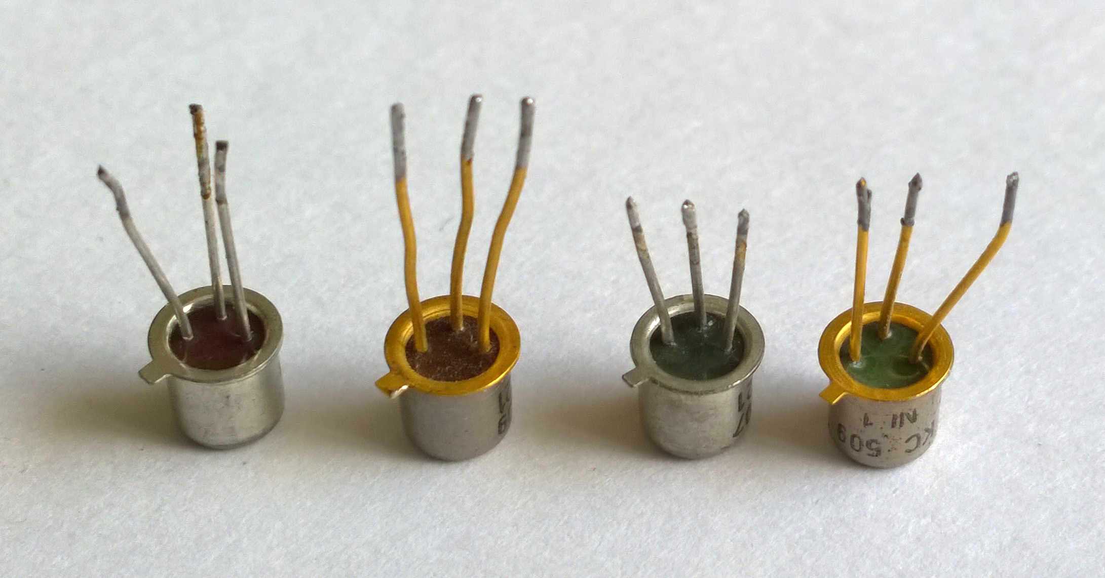 U trandů,tyristorů a IO z TESLY je nejčastější zelený sklo (KCxxx,KFxxx,vývodky trandů TO-3 a kovový IO),pak cihlová (některý KC,KSY a tyristory KT508) a bílá (malý trandy KC/KS a šroubový tyristory/triaky).Občas se objeví modrá,hlavně u tyristorů KT501-505.V NDR hlavně bílá,zelená a černá(SSY20,KSY34* a SF126-129).U západních hlavně modrá a bílá,často i zelená.