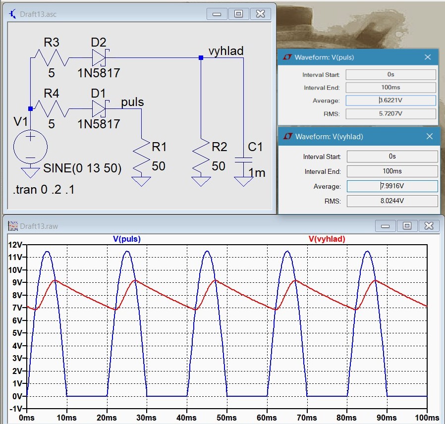 ad 1) Multimetr se musí přepnout na stejnosměrný rozsah. Takto ukáže jen střední hodnotu. Pokud není zvlnění po vyhlazení moc velké, tak se střední a efektivní hodnota moc neliší, ale bez vyhlazení (pulzy) se liší moc. Vidíš to i na simulaci dole.