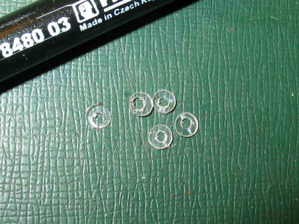 Odstrihnem z plastu hrubky 0,4-0,5mm (priehladny obal z neviem coho - odpad) maly stvorec, ten uchytim do zveraka a vyvrtam do stredu dieru vrtakom 1,5mm (netreba takmer vobec tlacit). Nasledne vyseknem 3mm vysecnikom kruh. Trafit do stredu je trochu problem, ale fungovat to bude aj krive Very Happy