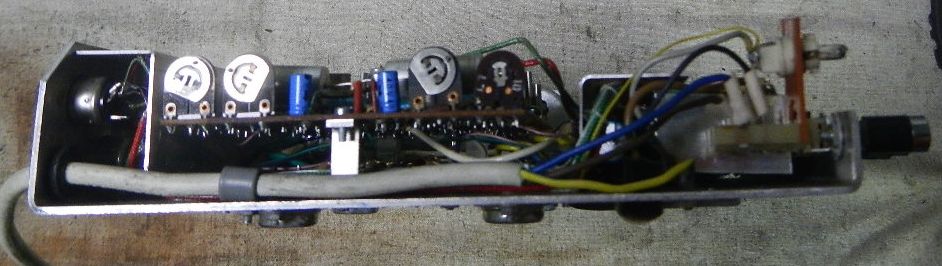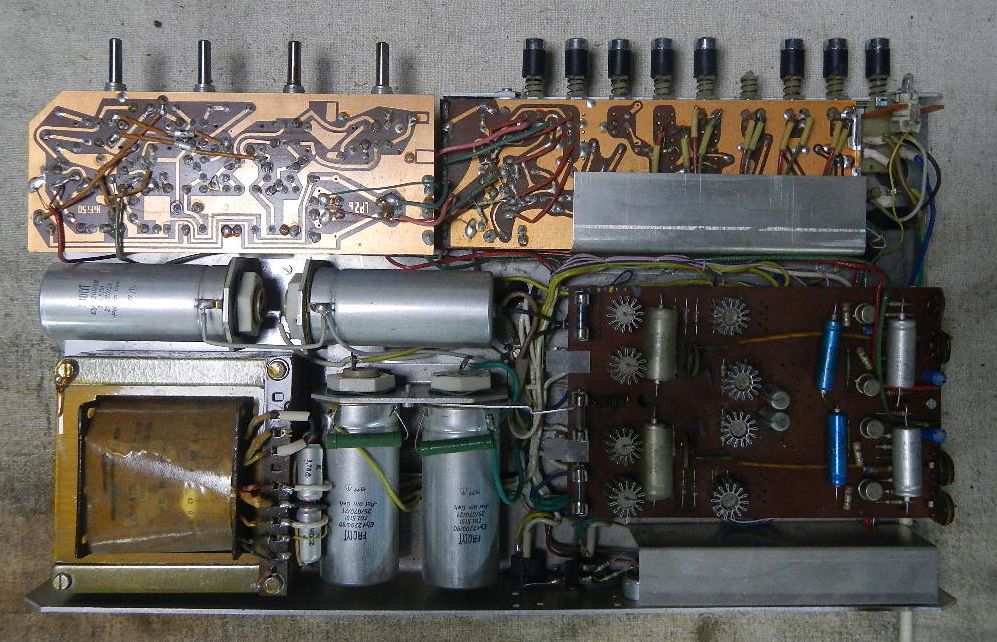 Dostal se mi do ruky tento zesilovač. Chybí jeden hmatník, ale jinak je kompletní a kupodivu funkční. Nemohu k tomu nikde najít schema.