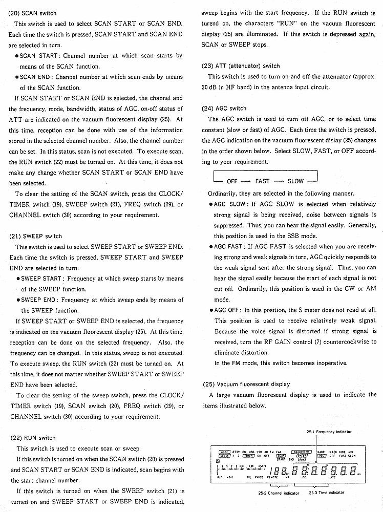 Jestliže je aktivována funkce SCAN START nebo SCAN END, zobrazí se na fluorescenčním displeji (25) číslo kanálu, frekvence, mód, šířka pásma, status AVC a stav ATT (zapnuto/vypnuto).