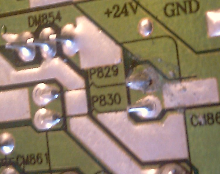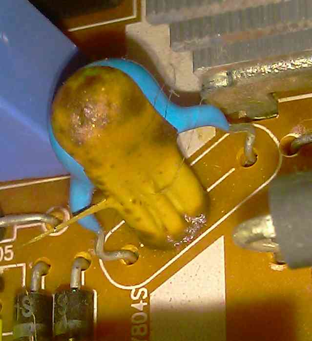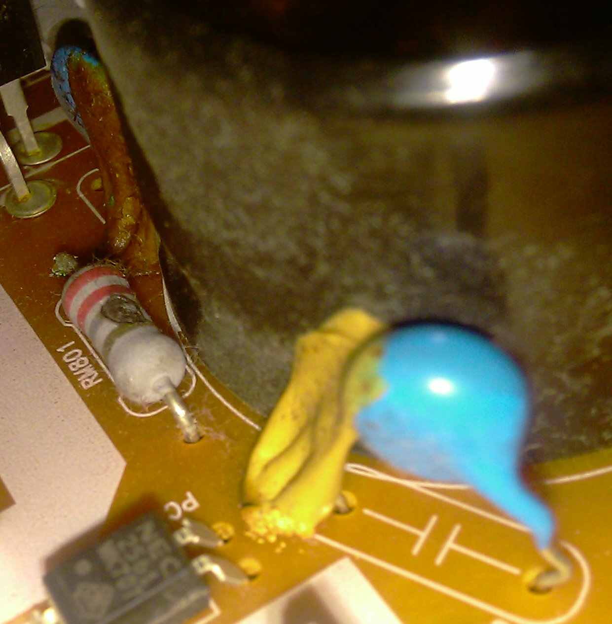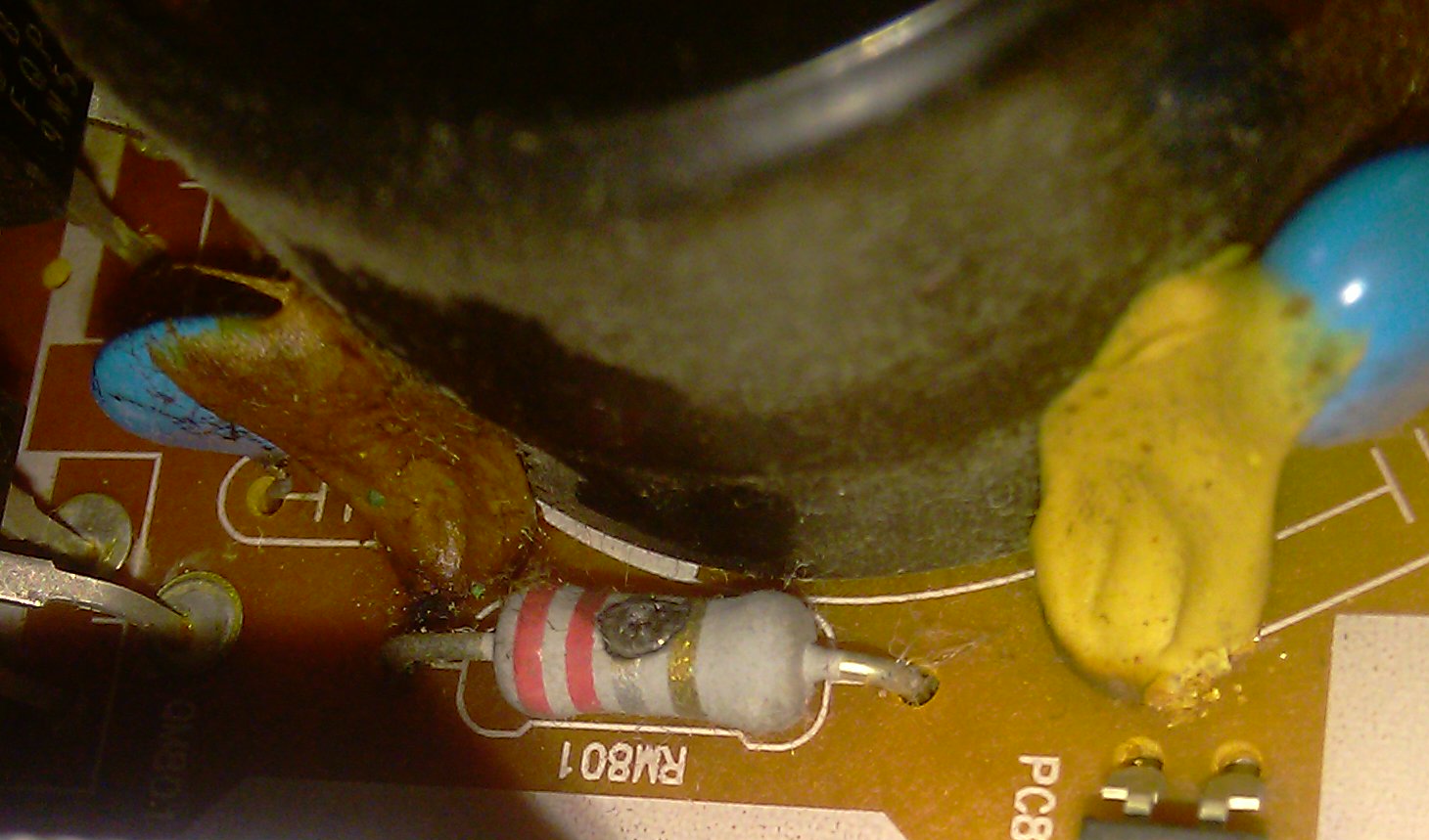 Příčina: I podle RU stránek je přičinou zkrat od fixačního tmelu, kterým jsou fixovány hlavně modré bezpečnostní kondenzátory. Tmel změnil (vlivem stáří, teploty, ...) barvu ze žluté na hnědou a jeho odpor je cca 100kOhmů/1cm, a to při měření obyčejným měřícím přístrojem s napětím 9V max. Při napětí přes 300V se z tmelu stane zřejmě vodič, který v místě rezistoru RM801 vyzkratoval plné usměrněné síťové napětí a rezistor RM801 splnil, co se od něho očekávalo. Tmel, který zateče do díry v DPS, dokáže úplně vyžrat měď a cín na straně spojů DPS.