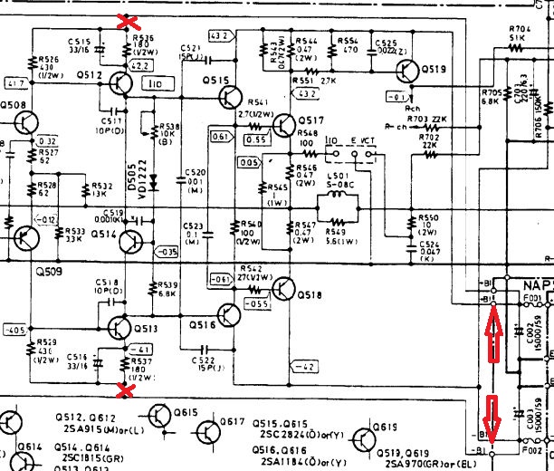 Pokud je tam skutečně 0 mV, tak koncovými transistory neteče žádný klidový proud. Jaké je napětí mezi bázemi Q517 a Q518?