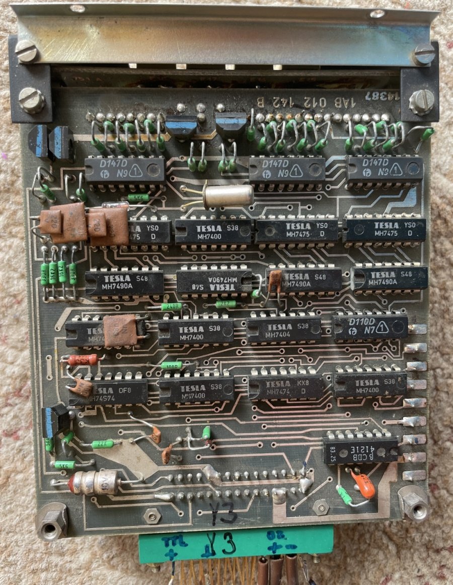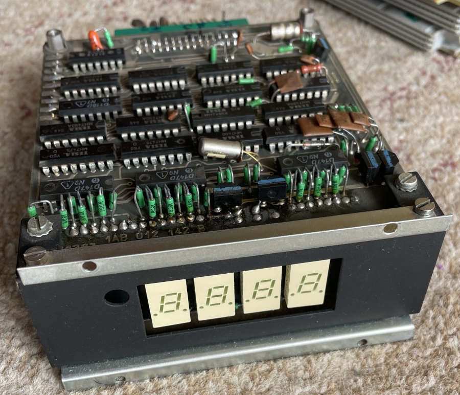 Je to čítací jednotka, pravděpodobně 3 1/2 místná, vidím tam 3ks dekodérů BCD/7segment (D147D), ty černý bakelitový 6-hranný špalíčky jsou teslácký trandy NPN KC148, ten kovovej kulatej futrál se dvěma nohama je nejspíš Ge dioda se zlatým hrotem - takhle se futrálovaly OA9, pod nima další řada jsou TTL šváby 7475, což jsou 4 KO typ "D" zapojovaný jako paměť BCD, 7400 je 4x 2-vstupovej NAND, v tomhle případě může sloužit ke zkrácení počítacího cyklu o řadu níž položenejch dekadickejch čítačů 7490A nebo k rozsvěcení desetinný tečky. Ještě níž položený 7474 jsou dvojice KO typ "D" používaný jako děličky 2, 7404 je 6 invertorů, D110D je podle odkazu ekvivalent 7410 neboli 3x 3-vstupovej NAND, úplně dole vzhůru nohama položenej β CDB 4121E (možná 41213) je něco rumunskýho, dost možná integrovanej MKO ekvivalentní TTL 74121.