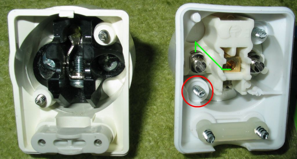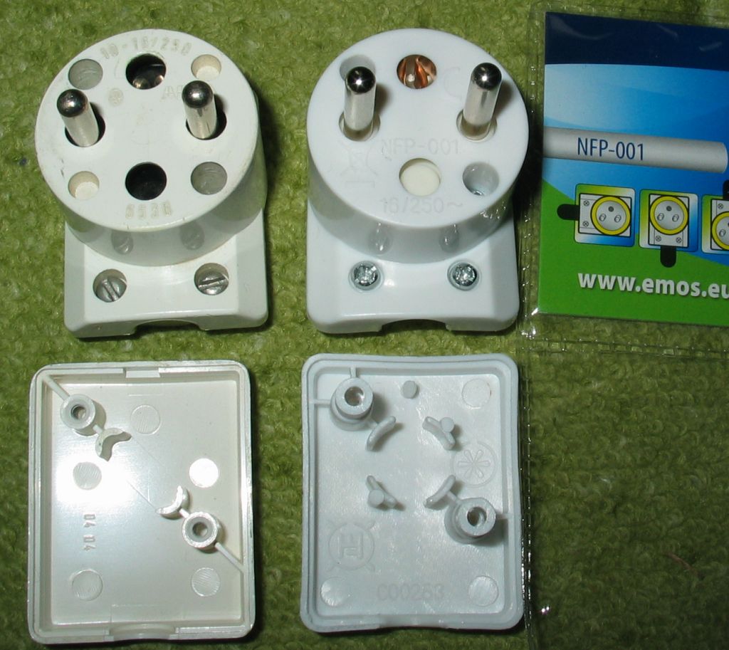 Ako do tejto nepodarenej polsko-cinskej kopie tradicnej ceskoslovenskej vidlice pripojit kabel? Jedna skrutka krytu ide presne cez miesto, kde vedie drot k lavemu koliku...